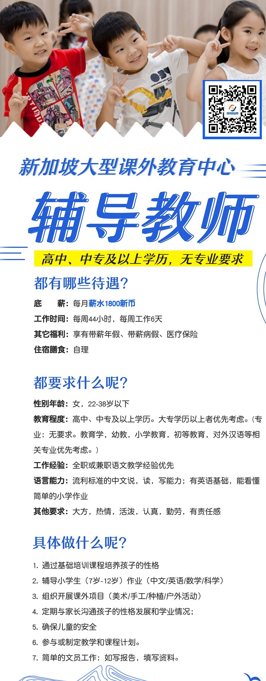 基本信息 岗位名称:幼儿教师 工作职责: 负责教授1.5-6岁孩子的华文课程以及日常生活照顾; - 有至少一年(包括实习时间)相关工作经验,喜欢与孩子相处; - 普通话标准流利,有学习力; - 会钢琴,善于舞蹈编舞,以及美术手工类艺术特长为佳; - 外貌和蔼可亲,热爱幼教行业,富有爱心,责任心,有团队精神。 招聘人数:若干 岗位要求 性别要求:女 年龄要求:45岁以下 学历:大专(幼儿/学前教育专业)(有学信网电子认证) 薪酬待遇 工作时间:每周工作44小时(不含吃饭时间),五天半工作制; 薪水: - 大专起始底薪1800-2000新币每月(看个人经验),包工作时间午餐。申请WP;本科起始底薪00新币每月,包工作时间午餐。可申请SP; 其他福利:年假10-14天,其余福利待遇依照MOM规定。 合同签证 合约:合约为期两年(可续约)。 准证:WP/SP 报名、面试及收费 报名所需材料: 1)简历 (详细的工作内容介绍,包括特长和获奖情况) 2)毕业证书扫描件(必须要求学前教育专业),本科需提供毕业证和学位证书。 3)大专和本科学历必须有教育网的注册表