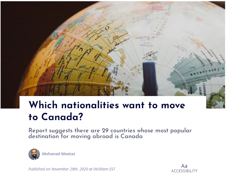 一份最新报告表明,最受欢迎的移民目的地仍然是加拿大。这项新研究分析了100多个国家/地区与出国和移民相关的词组的搜索量。