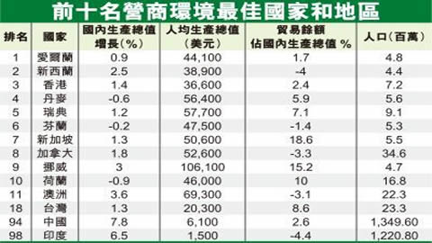 在福布斯第八届全球最宜经商的国家和地区年度排名中,爱尔兰首次夺魁。中国香港连续两年获得季军,尽管这个国际贸易和金融中心的经济增速已经放缓。