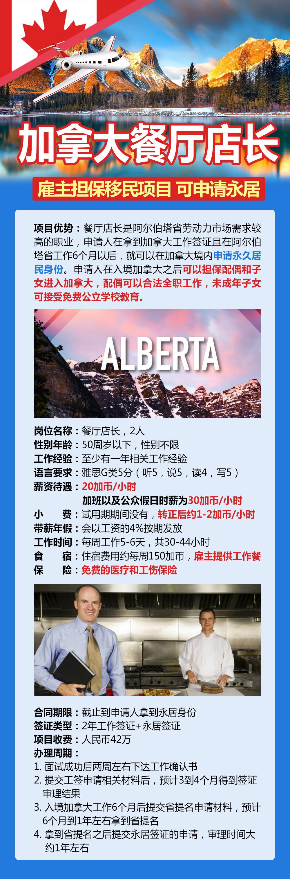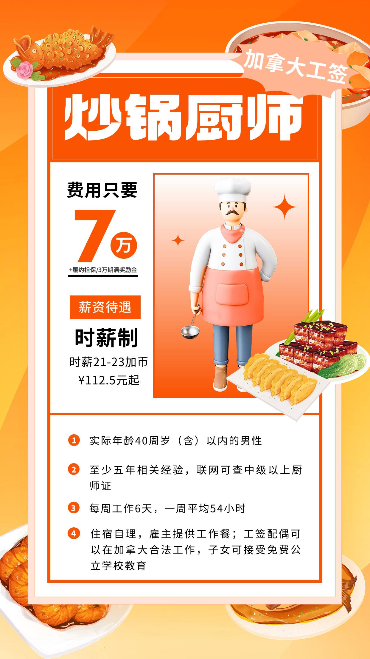 加拿大厨师招聘简章 简介: 加拿大,首都渥太华,位于北美洲北部。全国分10各省3个地区。 加拿大是全球最发达的 经济体之一,是西方七大工业国家之一。制造业、高科技产业、服务业发达,资源工业、初级制 造业和农业是国民经济的主要支柱。 项目优势: 该雇主拥有雇主担保资质,可以协助海外员工申请工签。工签持有人的配偶可以在加拿大合法全职工作,子女可接受免费公立学校教育。此外,工签持有人可享有免费医疗保险和雇主提供的工伤保险。 招聘要求 岗位名称:厨师,帮厨,面点师 招聘人数:若干人 性别年龄:30-45周岁,男 工作经验:国内4年以上厨房经验,或海外工作经验的证明 语言要求:无 证书要求:中级以上厨师证,或3年以上烹饪专业毕业证及相关证书 工作内容:餐厅炒锅,熟练切菜,备菜,腌菜等 薪酬待遇 薪资待遇:16-30加币/小时(根据技能水平而定)(每个省薪资都有不同差异) 工作时间:每周工作6天(周末休息的也有),40-60小时(根据雇主要求) 食 宿:房租自费500-700加币左右/月(单间);提供工作餐 保 险:享受公费医疗,有工伤保险 合同签证 合同期限:2年 (工作表现好可续签) 签证类型